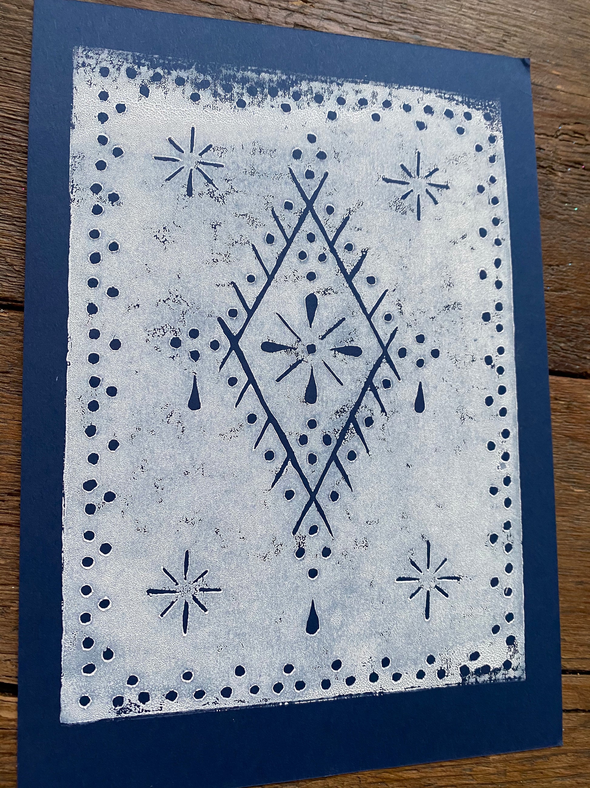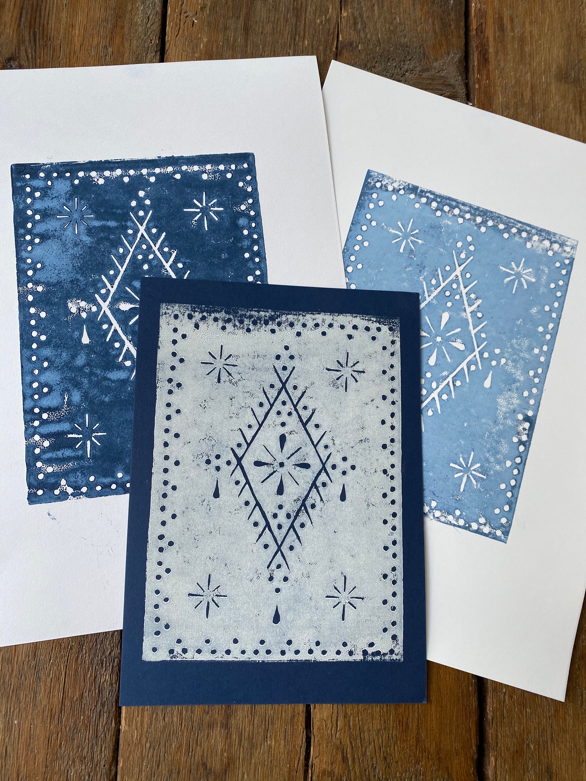 Hand cut Lino printed, white ink on indigo card, indigo on white etching paper or light indigo on white etching paper.